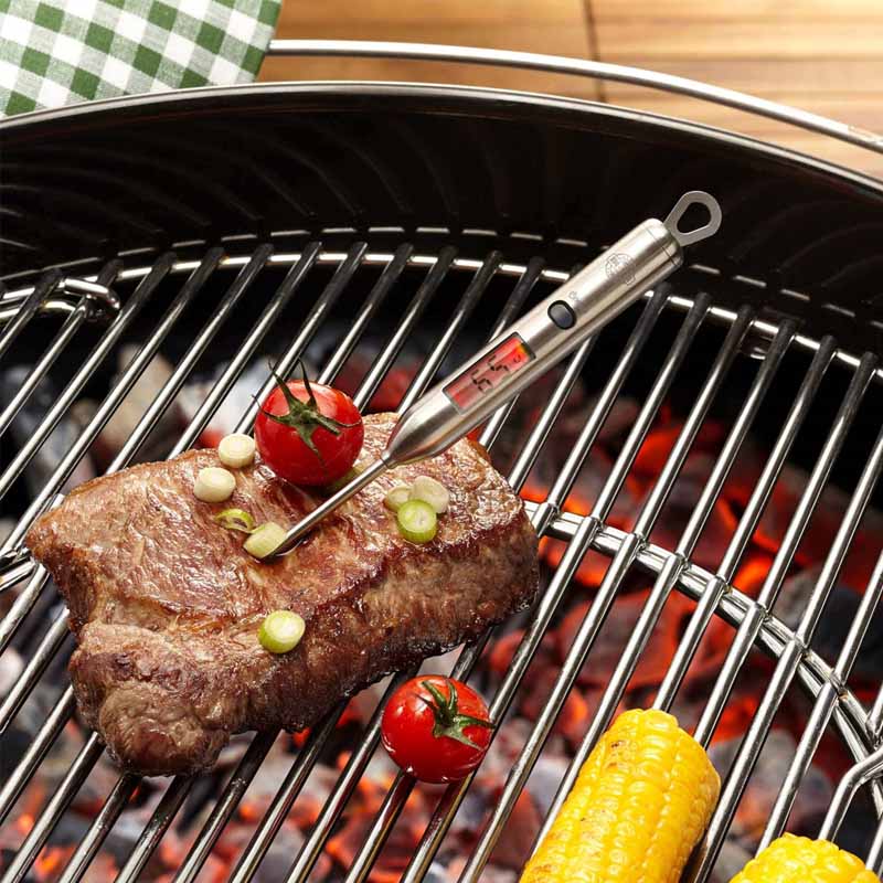 Dzięki stalowej sondzie pomiarowej z błyskawiczną reakcją umożliwia dokładne określenie temperatury w środku potrawy, co gwarantuje perfekcyjne przygotowanie mięsa – bez ryzyka przesuszenia czy niedogotowania.