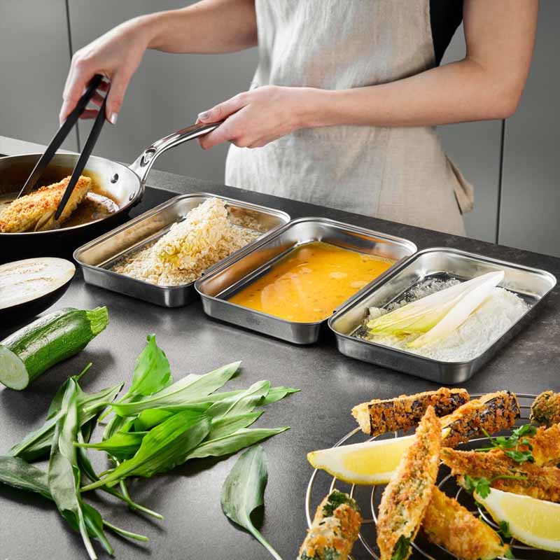 Zestaw zawiera trzy miski, które możesz w prosty sposób połączyć w linię – dzięki temu Twoje stanowisko do panierowania jest zawsze uporządkowane, a składniki nie mieszają się ze sobą.