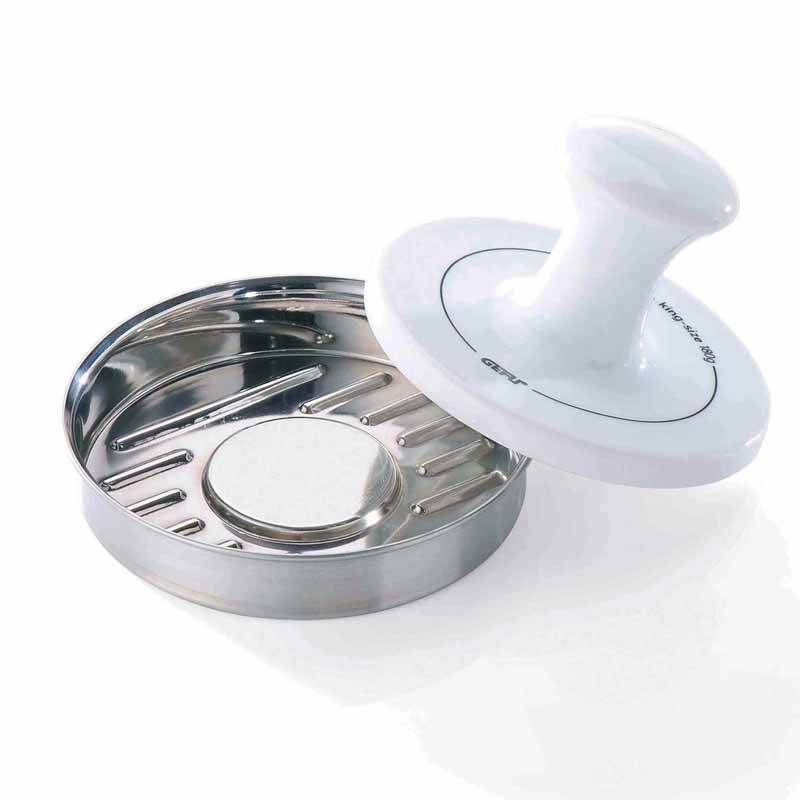 GEFU SPARK to solidna prasa do formowania burgerów, wykonana z wysokiej jakości stali nierdzewnej i porcelany, zaprojektowana z myślą o idealnym kształcie i strukturze każdego kotleta.